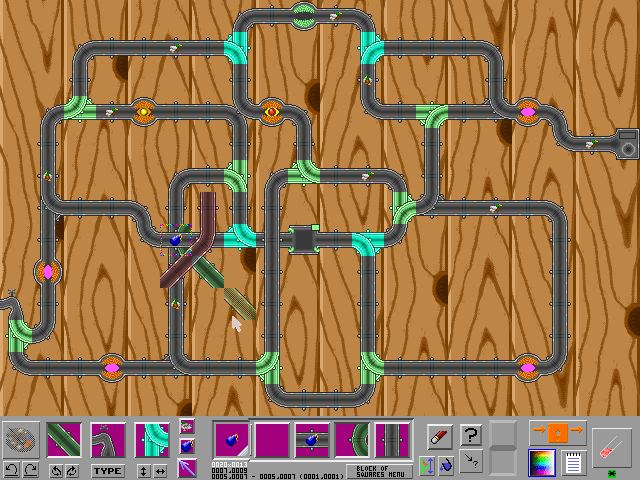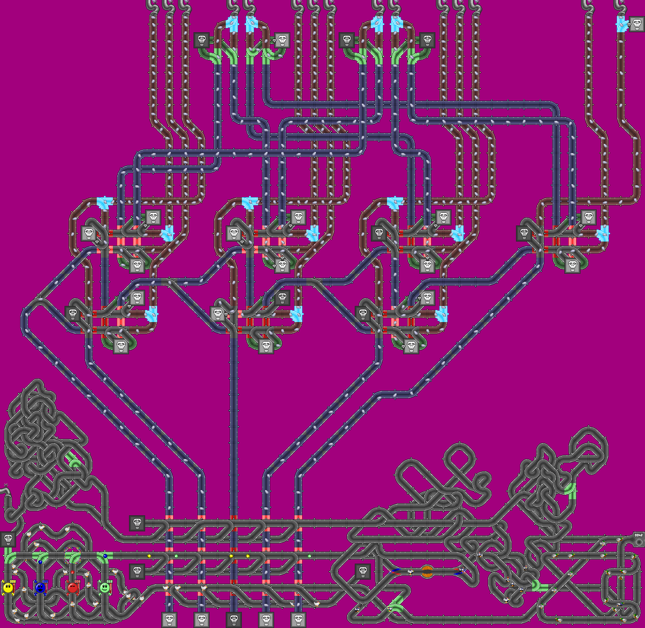 In order to clarify what is going on, the various pipes have been coloured. Red pipes feed the various components a steady stream of duck's eggs in order to power them (VCC). The blue pipes are like data-paths, and the green paths are used to dispose of unwanted ducks' eggs (GND). Black pipes are used for other purpouses (although static interchanges and Nearby-Object-Controlled Interchanges are always black). The skulls are dead-ends that dispose of any object trying to enter. They glow and shake for a short while if something touches one.